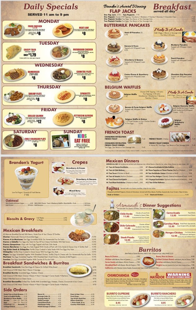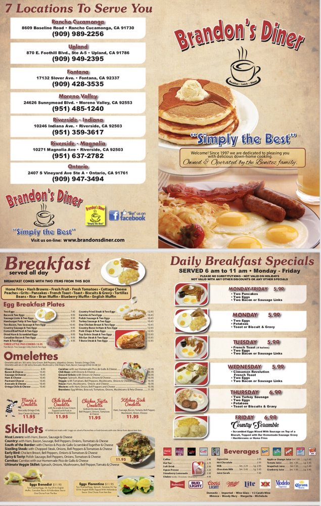 Brandon's Diner is a breakfast and brunch spot in Riverside, CA that also offers Mexican cuisine. With a cozy and clean ambiance, it's popular for its great service and tasty food. Customers rave about dishes like the chilaquiles and steak sandwich, as well as the chile verde omelette and Albondigas Soup. The menu includes vegan options and the diner is accommodating with wheelchair access and free Wi-Fi. The staff is friendly and attentive, creating a pleasant dining experience. Whether you're looking for a hearty breakfast, a quick lunch, or a delicious dinner, Brandon's Diner has something for everyone. Make sure to try their daily specials and enjoy the relaxed atmosphere while indulging in their delectable offerings.